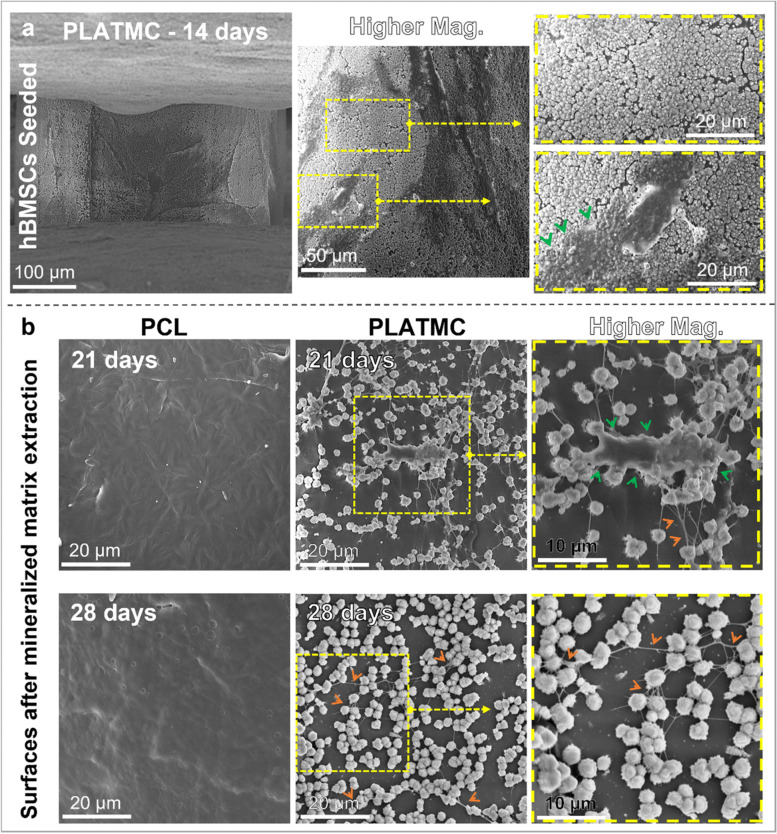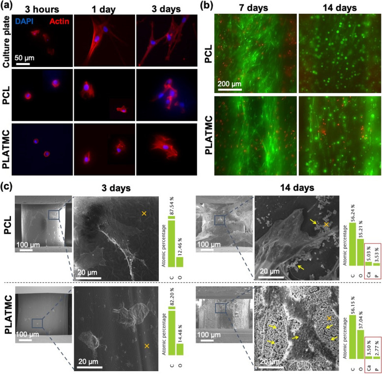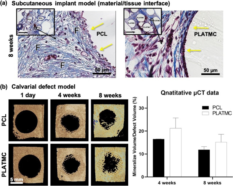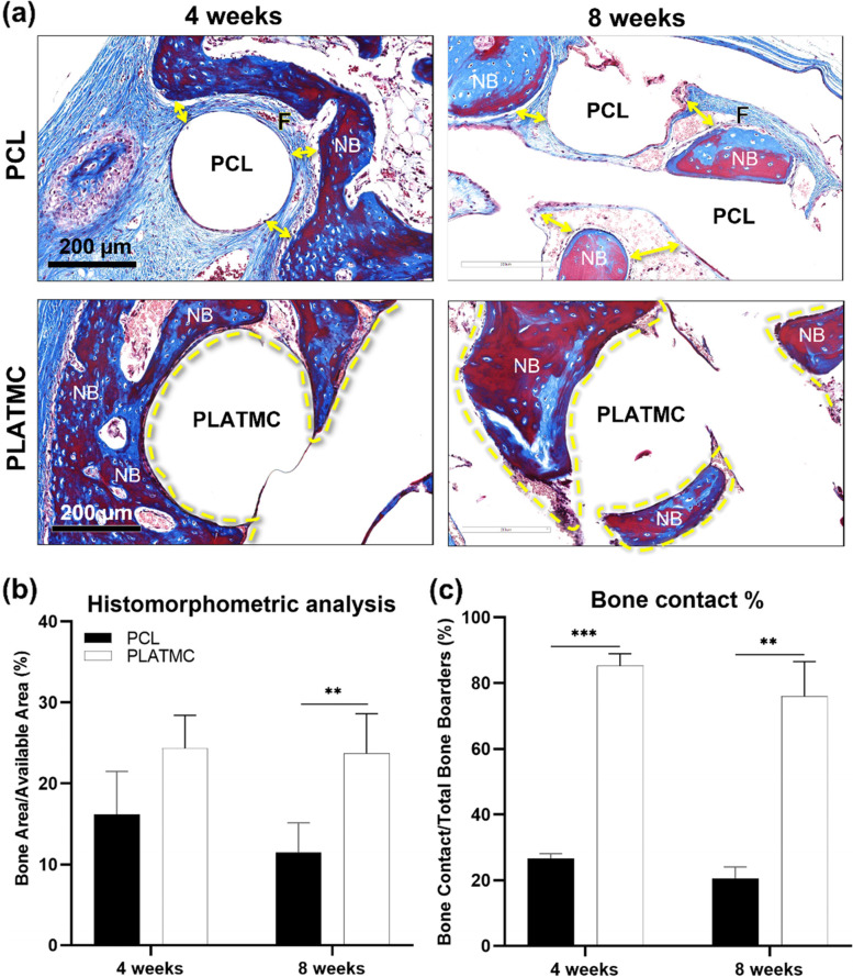 Results: Compared to PCL, PLATMC exhibited greater wettability, strength, degradation, and promoted osteogenic differentiation of hBMSCs, with superior osteoconductivity. However, the higher ALP activity disclosed by PCL group at 7 and 21 days did not dictate better osteoconductivity. This was confirmed in vivo in the calvarial defect model, where PCL disclosed distant osteogenesis, while PLATMC disclosed greater areas of new bone and obvious contact osteogenesis on surface.