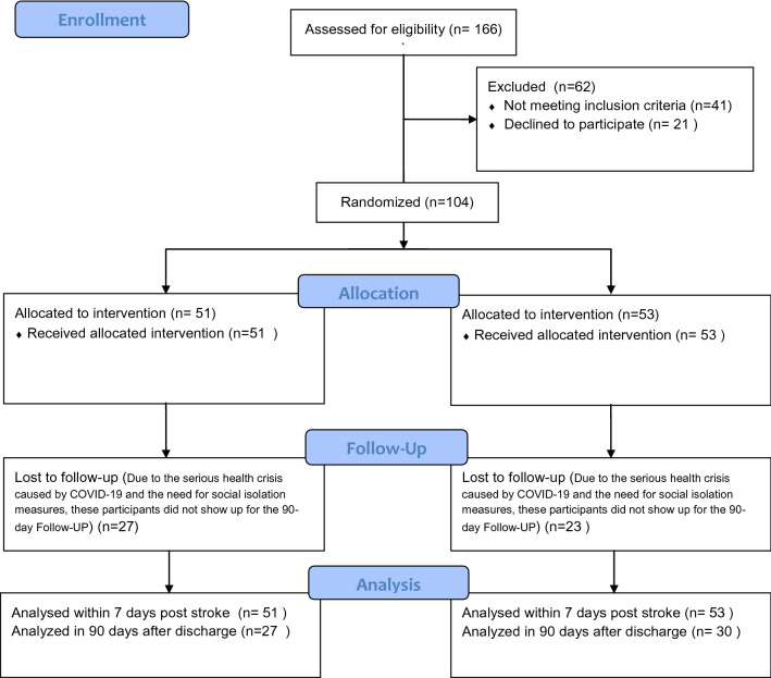 Methods: The present study was an open, prospective, randomized study, with no blinded outcome, carried out in the stroke unit of a tertiary referral hospital located in Salvador-Bahia, Brazil. The primary outcome was the level of functional independence. Secondary outcomes were functional mobility, balance, complications within 7 days of hospitalization and 90 days after hospital discharge, and length of stay.