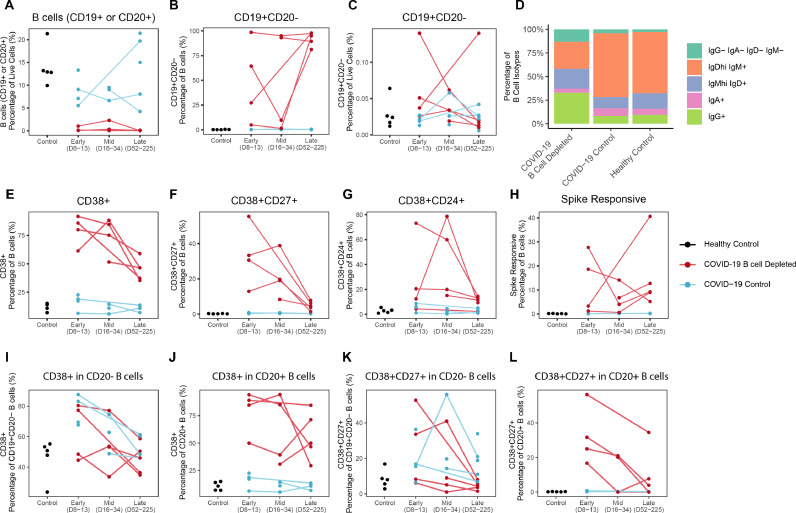 Results: Immune responses post-SARS-CoV-2 infection and vaccination were evaluated in a cohort of COVID-19 B cell depleted neuroimmune patients (n = 5), COVID-19 non-B cell depleted autoimmune patients (n = 15), COVID-19 immunocompetent patients (n = 117), and healthy controls (n = 6) for a total of 259 samples in 137 participants. 4/5 B cell-depleted patients developed detectable anti-spike RBD antibodies, which were boosted by vaccination in 2 patients. While spike RBD antibodies were associated with presence of CD20+ B cells, very few B cells were required. In contrast, patients whose B cell compartment primarily consisted of CD19+CD20- Bcells during acute COVID-19 disease or vaccination did not seroconvert. Interestingly, circulating Bcells in B cell depleted patients were significantly CD38high with co-expression of CD24 and CD27, indicating that B cell depletion may impact B cell activation patterns. Additionally, all B cell depleted patients mounted a sustained T cell response to SARS-CoV-2 antigens, regardless of seroconversion. Specifically, all patients developed naïve, central memory, effector memory, and effector memory RA+ T cells, suggesting intact T cell memory conversion in B cell depleted patients compared to controls.