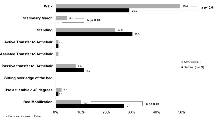 Early progressive mobilization is a safe strategy in the intensive care unit (ICU), however, it is still considered challenging by the inherent barriers and poor adherence to early mobilization protocol. The aim of this study was to evaluate the effectiveness of a quality improvement (QI) multifaceted strategy with implementation of a specific visual tool, the "mobility clock", in reducing non-compliance with the institutional early mobilization (EM) protocol in adult ICUs. A single-center QI with a retrospective before-after comparison study was conducted using data from medical records and hospital electronic databases. Patients from different periods presented similar baseline characteristics. After the QI strategy, a decline in "non-compliance" with the protocol was observed compared to the previous period (10.11% vs. 26.97%, p < 0.004). The proportion of patients walking was significantly higher (49.44% vs. 29.21%, p < 0.006) and the ICU readmission rate was lower in the "after" period (2.25% vs. 11.24%; p = 0.017). The multifaceted strategy specifically designed considering institutional barriers was effective to increase out of bed mobilization, to reduce the "non-compliance" rate with the protocol and to achieve a higher level of mobility in adult ICUs of a tertiary hospital.