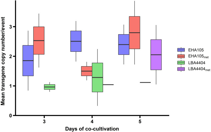 Auxotrophic strains of Agrobacterium tumefaciens can contribute to the development of more efficient transformation systems, especially for crops historically considered recalcitrant. Homologous recombination was used to derive methionine auxotrophs of two common A. tumefaciens strains, LBA4404 and EHA105. The EHA105 strains were more efficient for switchgrass transformation, while both the EHA105 and LBA4404 strains worked equally well for the rice control. Event quality, as measured by transgene copy number, was not affected by auxotrophy, but was higher for the LBA4404 strains than the EHA105 strains. Ultimately, the use of auxotrophs reduced bacterial overgrowth during co-cultivation and decreased the need for antibiotics.