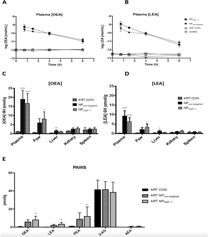 Nanoparticles and nano-delivery systems are constantly being refined and developed for biomedical applications such as imaging, gene therapy, and targeted delivery of drugs. Nanoparticles deliver beneficial effects by both release of their cargo and by liberation of their constitutive structural components. The N-acylethanolamines linoleoyl ethanolamide (LEA) and oleoyl ethanolamide (OEA) both exhibit endocannabinoid-like activity. Here, we report on their ability to form nanoparticles that when conjugated with tissue-specific molecules, are capable of localizing to specific areas of the body and reducing inflammation. The facilitation of pharmacological effects by endocannabinoids at targeted sites provides a novel biocompatible drug delivery system and a therapeutic approach to the treatment, patient management and quality of life, in conditions such as arthritis, epilepsy, and cancer.