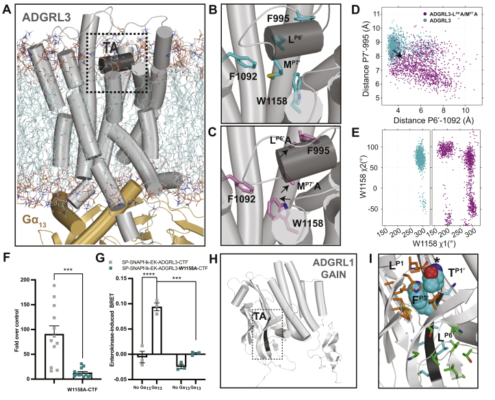Adhesion G protein-coupled receptor latrophilin 3 (ADGRL3), a cell adhesion molecule highly expressed in the central nervous system, acts in synapse formation through trans interactions with its ligands. It is largely unknown if these interactions serve a purely adhesive function or can modulate G protein signaling. To assess how different structural elements of ADGRL3 (e.g., the adhesive domains, autoproteolytic cleavage site, or tethered agonist (TA)) impact receptor function, we require constructs that disrupt specific receptor features without impacting others. While we showed previously that mutating conserved Phe and Met residues in the TA of ADGRL3-C-terminal fragment (CTF), a CTF truncated to the G protein-coupled receptor proteolysis site, abolishes receptor-mediated G protein activation, we now find that autoproteolytic cleavage is disrupted in the full-length version of this construct. To identify a construct that disrupts TA-dependent activity without impacting proteolysis, we explored other mutations in the TA. We found that mutating the sixth and seventh residues of the TA, Leu and Met, to Ala impaired activity in a serum response element activity assay for both full-length and CTF constructs. We confirmed this activity loss results from impaired G protein coupling using an assay that acutely exposes the TA through controlled proteolysis. The ADGRL3 mutant expresses normally at the cell surface, and immunoblotting shows that it undergoes normal autoproteolysis. Thus, we found a construct that disrupts tethered agonism while retaining autoproteolytic cleavage, providing a tool to disentangle these functions in vivo. Our approach and specific findings are likely to be broadly applicable to other adhesion receptors.