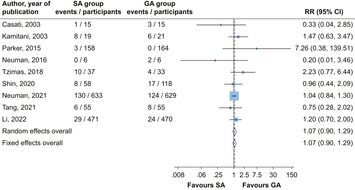 Methods: RCTs comparing any of the core outcomes (mortality, time from injury to surgery, acute coronary syndrome, hypotension, acute kidney injury, delirium, pneumonia, orthogeriatric input, being out of bed at day 1 postoperatively, and pain) or PPI-defined outcomes (return to preoperative residence, quality of life, and mobility status) between SA and GA were identified from MEDLINE, Embase, Cochrane Library, and Web of Science (2000 to February 2022). Pooled relative risks (RRs) and mean differences (95% confidence intervals [CIs]) were estimated.
