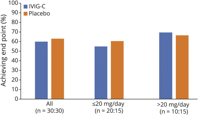 Results: The primary end point (≥50% reduction in CS dose) showed no significant difference between the IGIV-C treatment (60.0% of patients) and placebo (63.3%). There were no significant differences for secondary end points. Safety data indicated that IGIV-C was well tolerated.