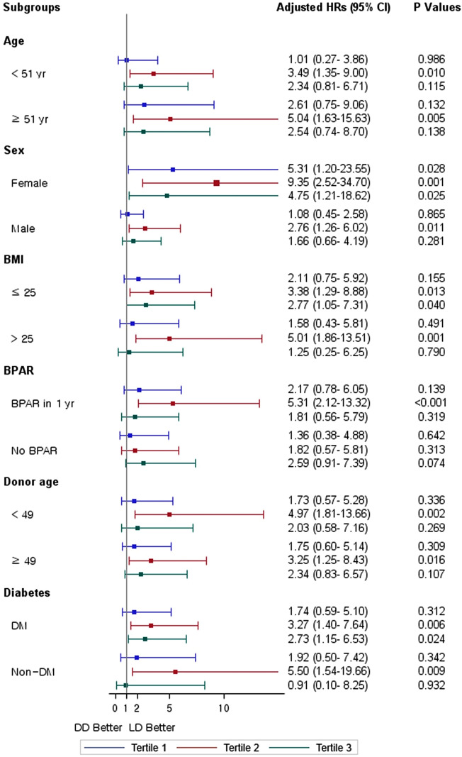 The waiting time for deceased donor kidney transplants (DDKT) is increasing. We evaluated DDKT prognosis according to the pretransplant dialysis vintage. A total of 4117 first-time kidney transplant recipients were enrolled from a prospective nationwide cohort in Korea. DDKT recipients were divided into tertiles according to pretransplant dialysis duration. Graft failure, mortality, and composite were compared between DDKT and living donor kidney transplant (LDKT) recipients. Pretransplant dialysis vintage was longer annually in DDKT recipients. In the subdistribution of the hazard model for the competing risk, the first tertile did not show an increased risk of graft failure compared with LDKT recipients; however, the second and third tertile groups had an increased risk of graft failure compared to LDKT recipients (adjusted hazard ratio [aHR] 3.59; 95% confidence interval [CI] 1.69-7.63; P < 0.001; aHR 2.37; 95% CI 1.06-5.33; P = 0.037). All DDKT groups showed a significantly higher risk of patient death than LDKT, with the highest risk in the third tertile group (aHR 11.12; 95% CI 4.94-25.00; P < 0.001). A longer pretransplant dialysis period was associated with a higher risk of the composite of patient death and graft failure in DDKT recipients. DDKT after a short period of dialysis had non-inferior results on graft survival compared with LDKT.