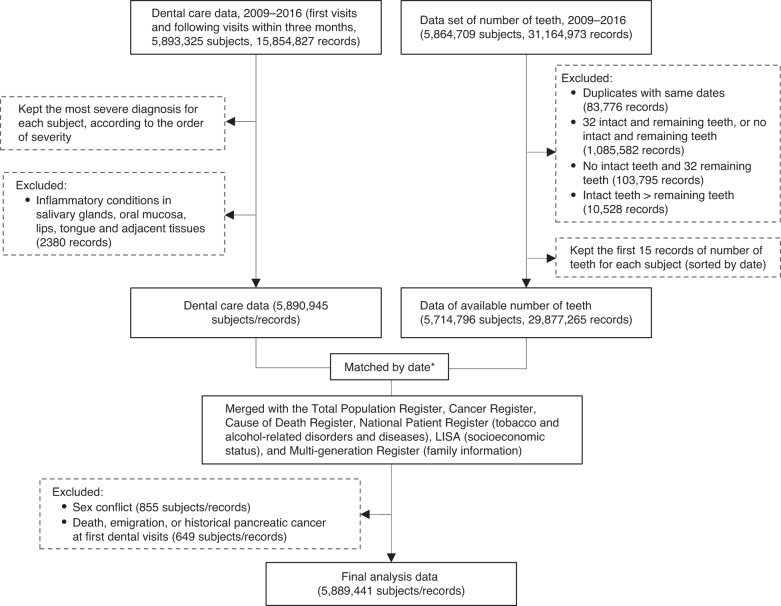 Methods: Information of exposures (dental caries, root canal infection, mild inflammation, and periodontitis; the number of teeth) was ascertained from the Swedish Dental Health Register, and occurrence of pancreatic cancer was identified from both cancer and cause of death registries. Hazard ratios (HRs) were estimated using Cox models.