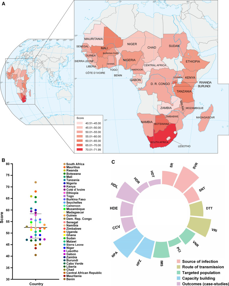 Results: Overall, five indicators associated with weights were generated as follows: source of infection (23.70%), route of transmission (25.31%), targeted population (19.09%), capacity building (16.77%), and outcomes/case studies (15.13%). Following the indicators, a total of 37 sub-Sahara African countries aligned with OHIZ validation, while 11 territories were excluded for unfit or missing data. The OHIZ average score of sub-Saharan Africa was estimated at 53.67/100. The highest score was 71.99 from South Africa, while the lowest score was 40.51 from Benin. It is also worth mentioning that Sub-Sahara African countries had high performance in many subindicators associated with zoonoses, e.g., surveillance and response, vector and reservoir interventions, and natural protected areas, which suggests that this region had a certain capacity in control and prevention or responses to zoonotic events.