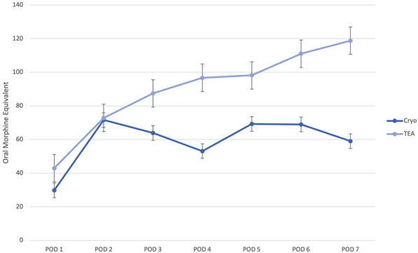 Methods: Seventy-two patients who underwent bilateral lung transplantation via clamshell incision at our center from 2016 to 2018 were managed with TEA (N = 43) or Cryo (N = 29). We evaluated analgesic-specific complications, opioid use in oral morphine equivalents (OME), and pain scores (0-10) through postoperative day 7. Adjusted linear regression was used to assess for non-inferiority of Cryo to TEA.