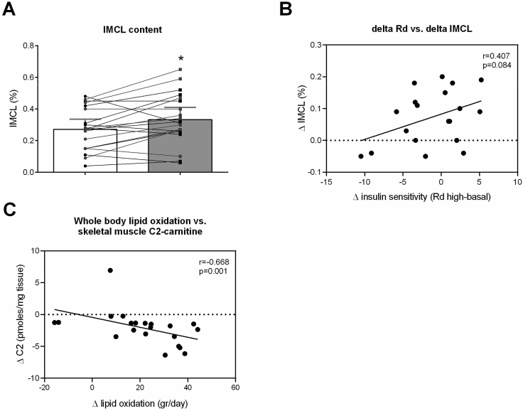 Results: Mitochondrial function, mitochondrial network integrity and citrate synthase and carnitine acetyltransferase activities in skeletal muscle were unaltered after dapagliflozin treatment. Dapagliflozin treatment increased intramyocellular lipid content (0.060 (0.011, 0.110) %, p = 0.019). Myocellular lipid droplets increased in size (0.03 μm2 (0.01-0.06), p < 0.05) and number (0.003 μm-2 (-0.001-0.007), p = 0.09) upon dapagliflozin treatment. CPT1A, CPT1B and malonyl CoA-decarboxylase mRNA expression was increased by dapagliflozin. Fasting acylcarnitine species and C4-OH carnitine levels (0.4704 (0.1246, 0.8162) pmoles∗mg tissue-1, p < 0.001) in skeletal muscle were higher after dapagliflozin treatment, while acetylcarnitine levels were lower (-40.0774 (-64.4766, -15.6782) pmoles∗mg tissue-1, p < 0.001). Fasting levels of several amino acids, succinate, alpha-ketoglutarate and lactate in skeletal muscle were significantly lower after dapagliflozin treatment.
