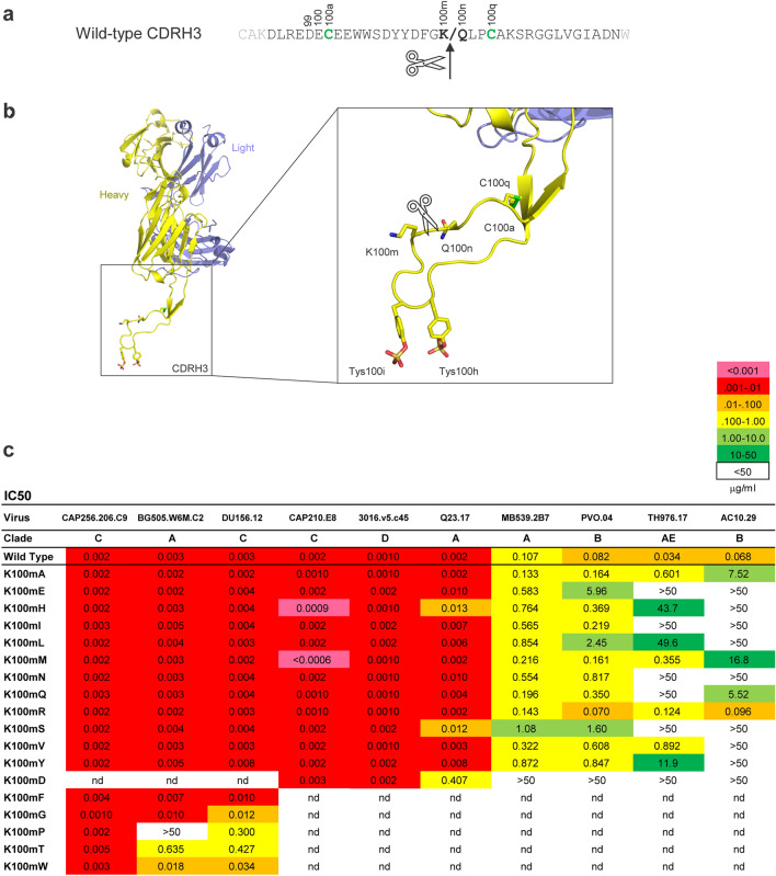 The broadly neutralizing antibody (bNAb) CAP256-VRC26.25 has exceptional potency against HIV-1 and has been considered for clinical use. During the characterization and production of this bNAb, we observed several unusual features. First, the antibody appeared to adhere to pipette tips, requiring tips to be changed during serial dilution to accurately measure potency. Second, during production scale-up, proteolytic cleavage was discovered to target an extended heavy chain loop, which was attributed to a protease in spent medium from 2-week culture. To enable large scale production, we altered the site of cleavage via a single amino acid change, K100mA. The resultant antibody retained potency and breadth while avoiding protease cleavage. We also added the half-life extending mutation LS, which improved the in vivo persistence in animal models, but did not impact neutralization activity; we observed the same preservation of neutralization for bNAbs VRC01, N6, and PGDM1400 with LS on a 208-virus panel. The final engineered antibody, CAP256V2LS, retained the extraordinary neutralization potency of the parental antibody, had a favorable pharmacokinetic profile in animal models, and was negative in in vitro assessment of autoreactivity. CAP256V2LS has the requisite potency, developability and suitability for scale-up, allowing its advancement as a clinical candidate.
