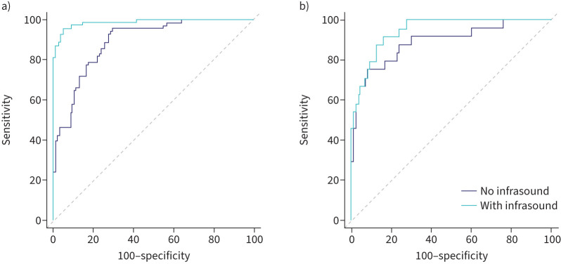Results: Standard auscultation found that 72% of the non-COVID-19 pneumonia patients had abnormal lung sounds compared with only 25% of the COVID-19 pneumonia patients. The classifier's sensitivity and specificity for the detection of COVID-19 pneumonia were 97% and 93%, respectively, when analysing the sound and infrasound data, and they were reduced to 93% and 80%, respectively, without the infrasound data (p<0.01 difference in receiver operating characteristic curves with and without infrasound).