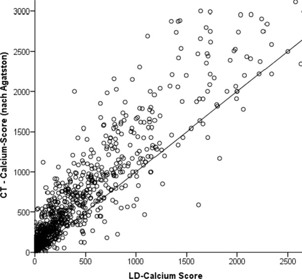 Conclusion: In a large patient population, despite a good correlation between CACS calculated with standard and low-dose CT, there is a systematic underestimation of CACS with the low-dose protocol. This may have an impact especially on the prognostic value of the calcium score, and the established "power of zero" may no longer be warranted if CACS is assessed with low-dose CT.