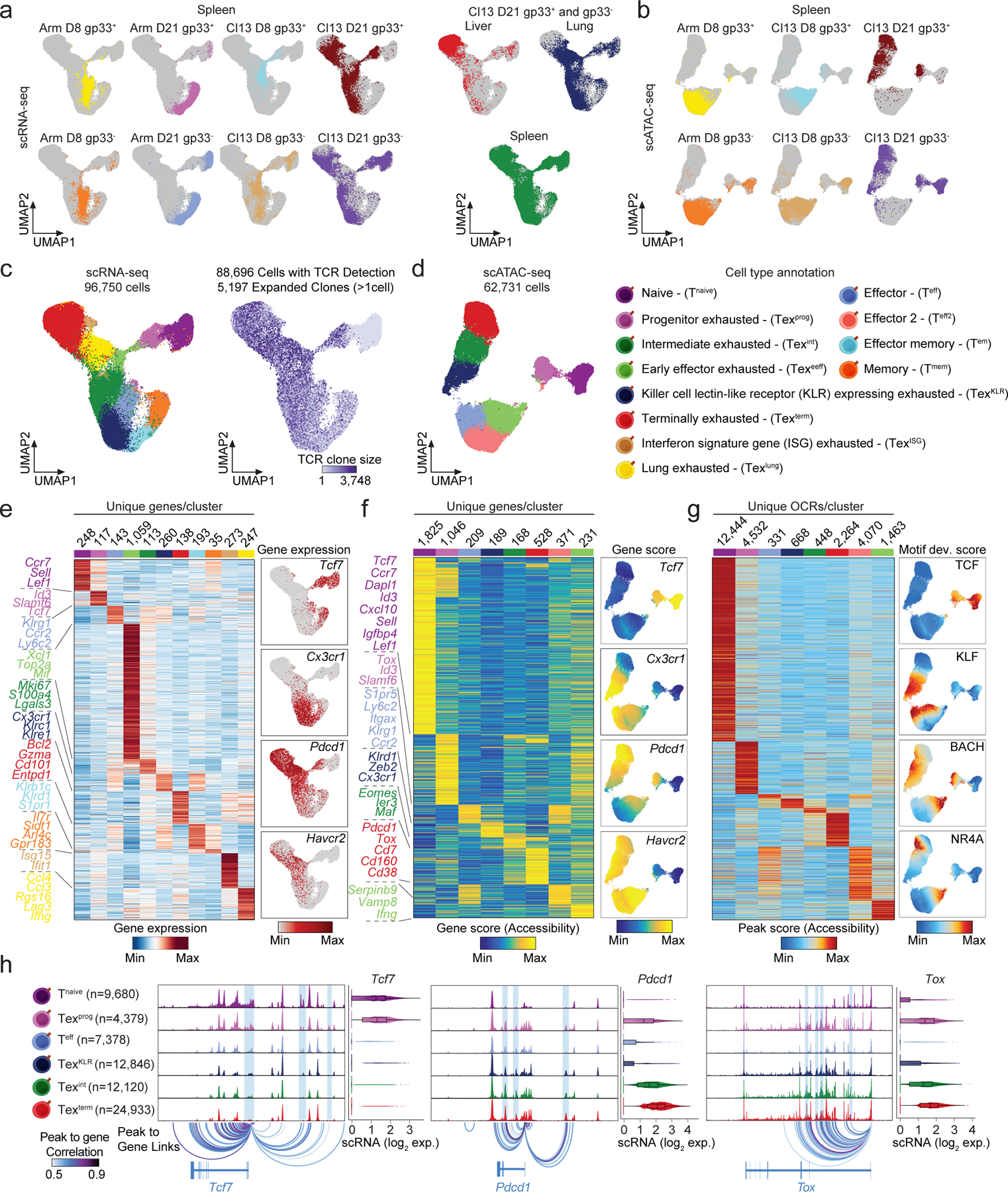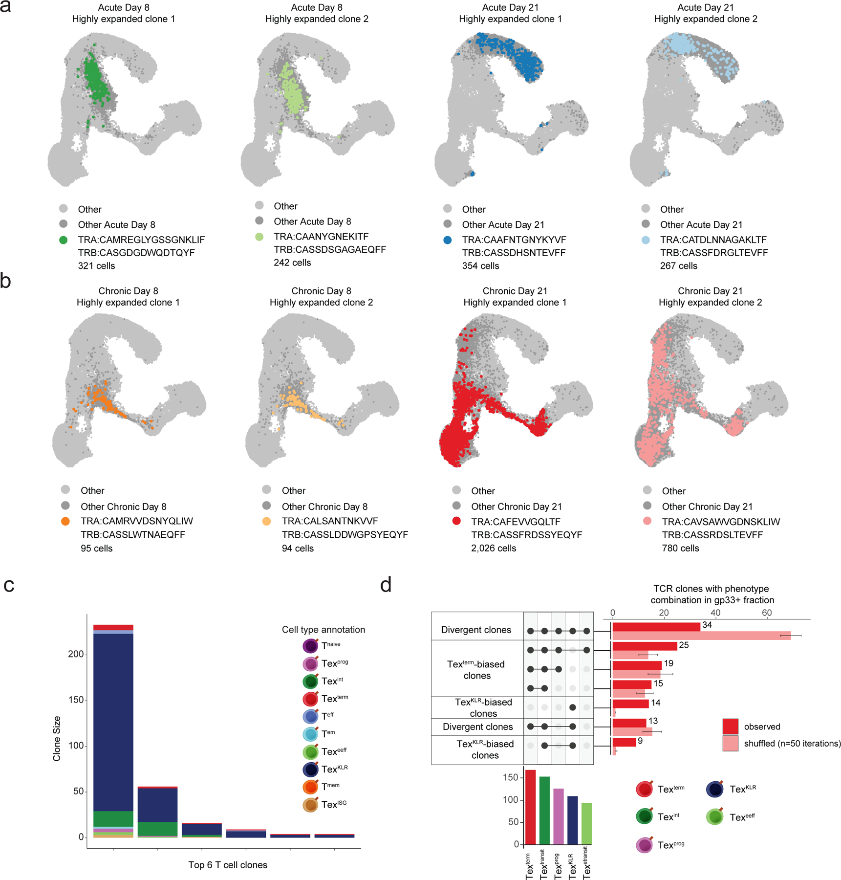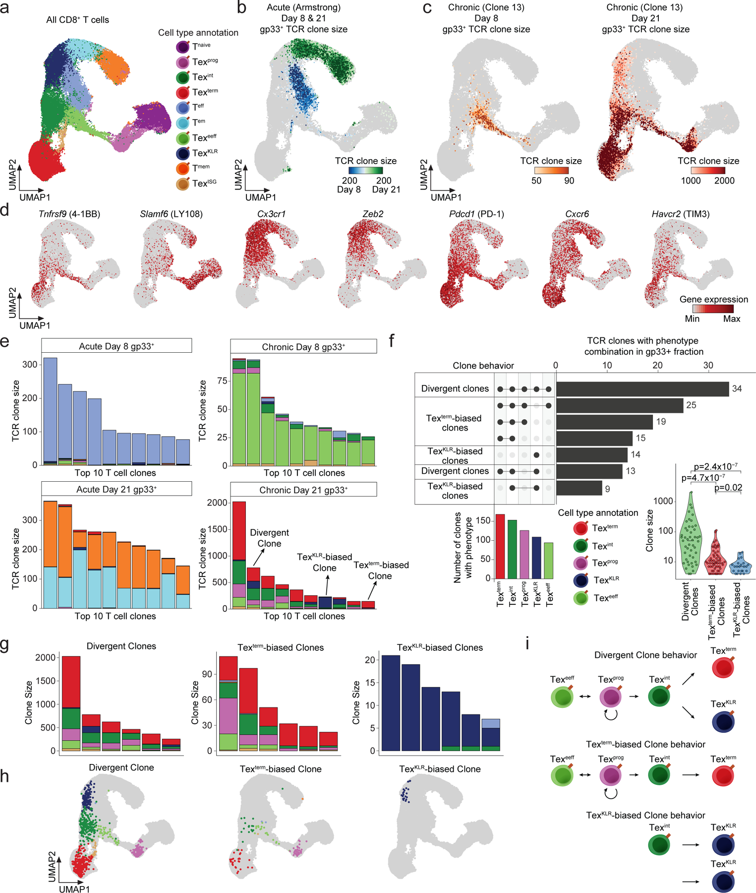 Chronic antigen exposure during viral infection or cancer promotes an exhausted T cell (Tex) state with reduced effector function. However, whether all antigen-specific T cell clones follow the same Tex differentiation trajectory remains unclear. Here, we generate a single-cell multiomic atlas of T cell exhaustion in murine chronic viral infection that redefines Tex phenotypic diversity, including two late-stage Tex subsets with either a terminal exhaustion (Texterm) or a killer cell lectin-like receptor-expressing cytotoxic (TexKLR) phenotype. We use paired single-cell RNA and T cell receptor sequencing to uncover clonal differentiation trajectories of Texterm-biased, TexKLR-biased or divergent clones that acquire both phenotypes. We show that high T cell receptor signaling avidity correlates with Texterm, whereas low avidity correlates with effector-like TexKLR fate. Finally, we identify similar clonal differentiation trajectories in human tumor-infiltrating lymphocytes. These findings reveal clonal heterogeneity in the T cell response to chronic antigen that influences Tex fates and persistence.