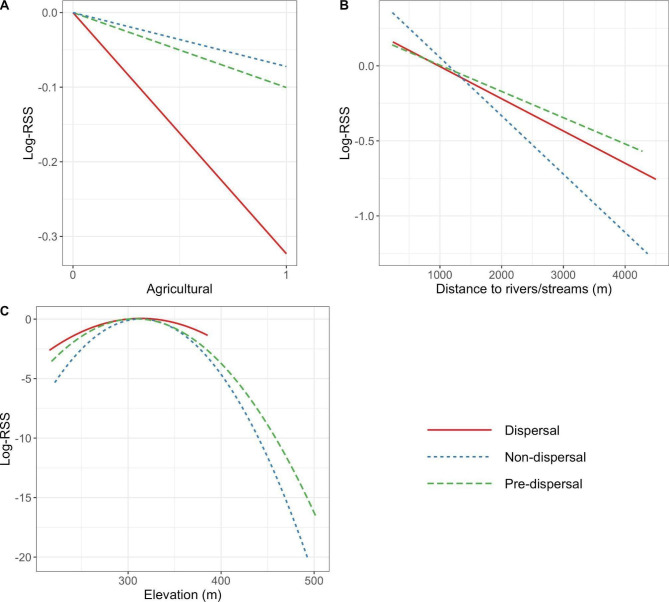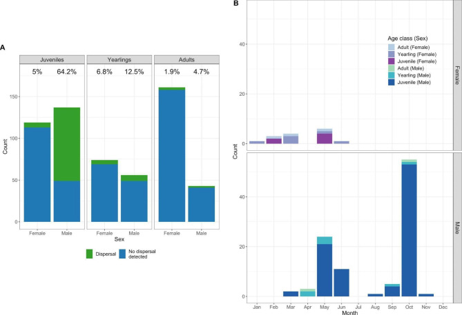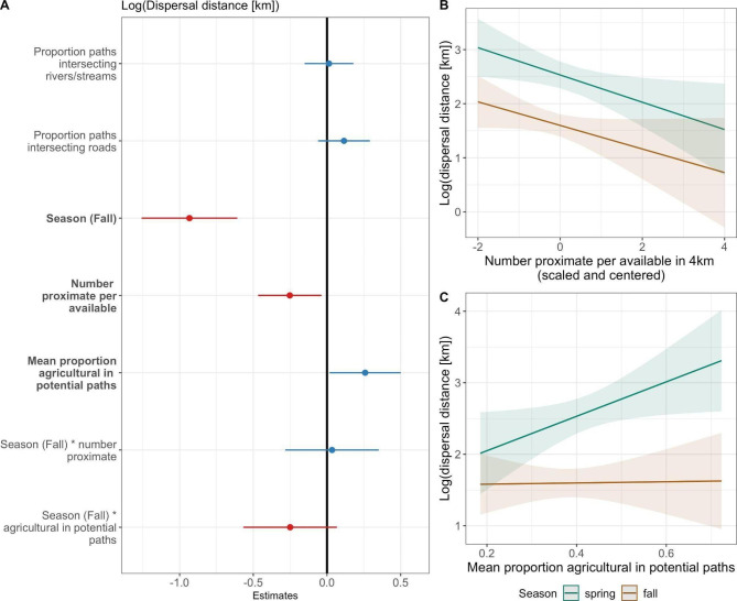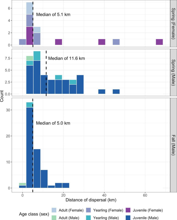 Results: Dispersal predominantly occurred in juvenile males, of which 64.2% dispersed, with dispersal events uncommon in other sex and age classes. Juvenile male dispersal probability was positively associated with the proportion of the natal range that was classified as agricultural land use, but only during the spring. Dispersal distances were typically short (median 5.77 km, range: 1.3-68.3 km), especially in the fall. Further, dispersal distances were positively associated with agricultural land use in potential dispersal paths but negatively associated with the number of proximate deer in the natal range. Lastly, we found that, during dispersal, juvenile males typically avoided agricultural land use but selected for areas near rivers and streams.