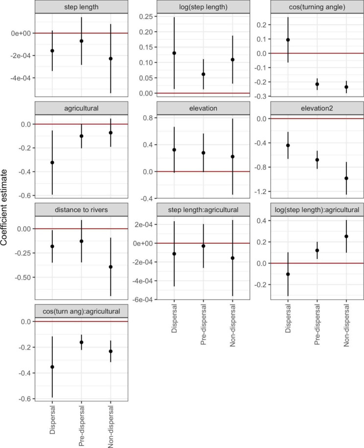 Methods: We developed an algorithmic approach to detect dispersal events from GPS collar data for 590 juvenile, yearling, and adult WTD. We used statistical models to identify host and landscape drivers of dispersal rates and distances, including the role of agricultural land use, the traversability of the landscape, and potential interactions between deer. We then performed a step selection analysis to determine how landscape features such as agricultural land use, elevation, rivers, and roads affected deer dispersal paths.