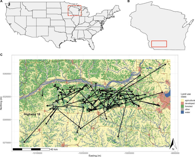Keywords: Agricultural land use; Cervid; Chronic wasting disease; Gene flow; Movement barriers; Pathogen spread; Resource selection; Social ecology; Step selection analysis; Wisconsin.