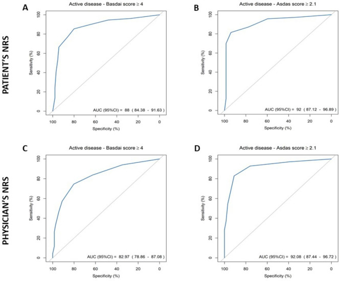 Methods: This was a cross-sectional, real-world study conducted in 17 Brazilian private health care institutes. Patients were selected if diagnosed with AS or axial radiographic spondyloarthritis (AxSpA) and treated with NSAIDs or TNFi for at least 12 weeks within the last 26 weeks prior to enrollment. The data were collected from interviewed-based and self-administered questionnaires from patients and physicians. Disease activity was defined as active (≥ 4), low /suboptimal (≥ 2 and < 4) and inactive (< 4) by Bath AS Disease Activity Index (BASDAI) and/or very high (≥ 3.5), high (≥ 2.1 to < 3.5), low (≥ 1.3 to < 2.1), and inactive (< 1.3) by AS Disease Activity Score (ASDAS-CRP). Both patients and physicians' perceptions of disease control were assessed using a numeric rating scale (NRS; 0-inactive to 10-very active disease).