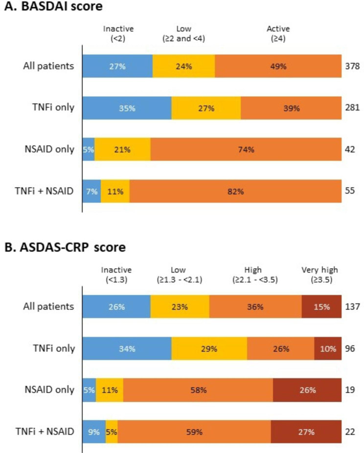 Conclusion: This real-world study showed that most AS patients on TNFi and/or NSAID had not achieved an adequate disease control, as almost 75% of them exhibited active disease or low activity/suboptimal disease control. There remains a need for improved disease management among patients with AS.