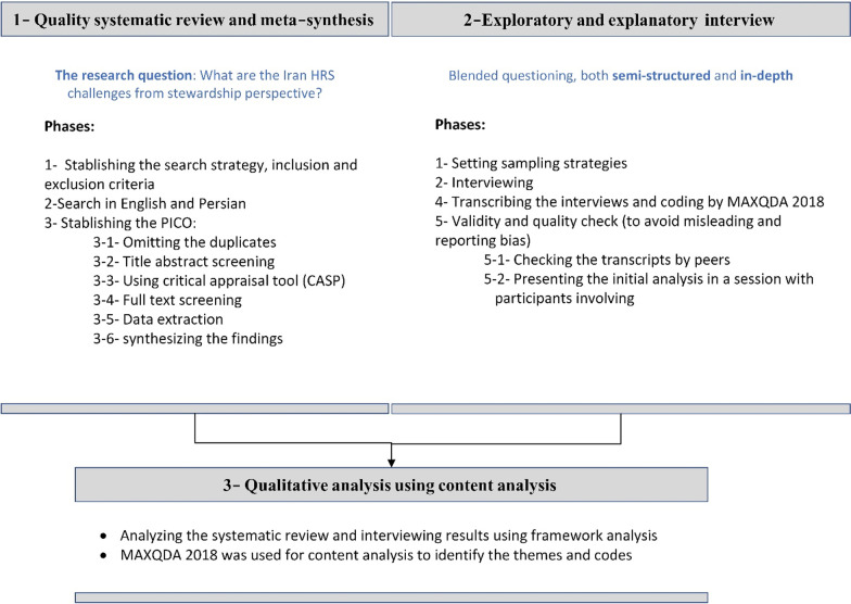 Methods: This study was carried out between March 2020 and April 2021 using a systematic review and meta-synthesis of evidence to examine the Iranian HRS stewardship challenges and interview 32 stakeholders, using a critical case sampling and snowballing approach which included both semi-structured and in-depth interviews. The interviewees were selected based on criteria covering policy-makers, managers, research bodies and nongovernmental organizations (NGOs) in health research-related fields like higher education, research, technology, innovation and science. All data were analysed using content analysis to determine eight main groups of findings under three levels: macro, meso, and micro.