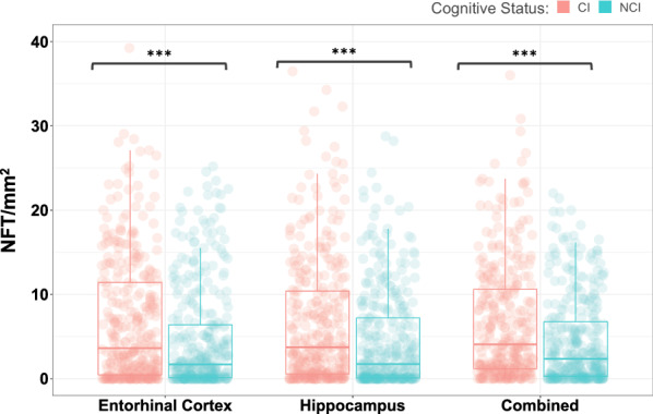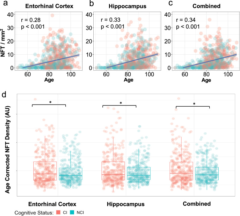 Tauopathies are a category of neurodegenerative diseases characterized by the presence of abnormal tau protein-containing neurofibrillary tangles (NFTs). NFTs are universally observed in aging, occurring with or without the concomitant accumulation of amyloid-beta peptide (Aβ) in plaques that typifies Alzheimer disease (AD), the most common tauopathy. Primary age-related tauopathy (PART) is an Aβ-independent process that affects the medial temporal lobe in both cognitively normal and impaired subjects. Determinants of symptomology in subjects with PART are poorly understood and require clinicopathologic correlation; however, classical approaches to staging tau pathology have limited quantitative reproducibility. As such, there is a critical need for unbiased methods to quantitatively analyze tau pathology on the histological level. Artificial intelligence (AI)-based convolutional neural networks (CNNs) generate highly accurate and precise computer vision assessments of digitized pathology slides, yielding novel histology metrics at scale. Here, we performed a retrospective autopsy study of a large cohort (n = 706) of human post-mortem brain tissues from normal and cognitively impaired elderly individuals with mild or no Aβ plaques (average age of death of 83.1 yr, range 55-110). We utilized a CNN trained to segment NFTs on hippocampus sections immunohistochemically stained with antisera recognizing abnormal hyperphosphorylated tau (p-tau), which yielded metrics of regional NFT counts, NFT positive pixel density, as well as a novel graph-theory based metric measuring the spatial distribution of NFTs. We found that several AI-derived NFT metrics significantly predicted the presence of cognitive impairment in both the hippocampus proper and entorhinal cortex (p < 0.0001). When controlling for age, AI-derived NFT counts still significantly predicted the presence of cognitive impairment (p = 0.04 in the entorhinal cortex; p = 0.04 overall). In contrast, Braak stage did not predict cognitive impairment in either age-adjusted or unadjusted models. These findings support the hypothesis that NFT burden correlates with cognitive impairment in PART. Furthermore, our analysis strongly suggests that AI-derived metrics of tau pathology provide a powerful tool that can deepen our understanding of the role of neurofibrillary degeneration in cognitive impairment.