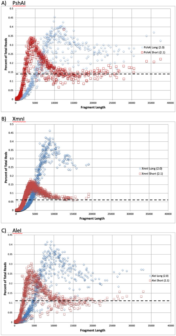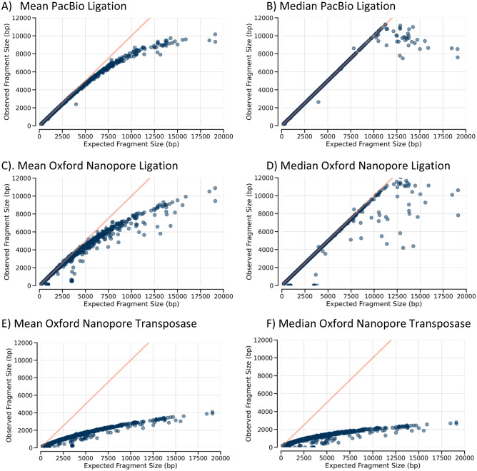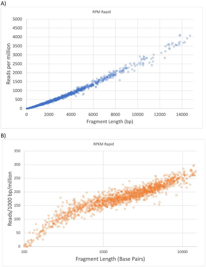 There are many applications in which quantitative information about DNA mixtures with different molecular lengths is important. Gene therapy vectors are much longer than can be sequenced individually via short-read NGS. However, vector preparations may contain smaller DNAs that behave differently during sequencing. We have used two library preparations each for Pacific Biosystems (PacBio) and Oxford Nanopore Technologies NGS to determine their suitability for quantitative assessment of varying sized DNAs. Equimolar length standards were generated from E. coli genomic DNA. Both PacBio library preparations provided a consistent length dependence though with a complex pattern. This method is sufficiently sensitive that differences in genomic copy number between DNA from E. coli grown in exponential and stationary phase conditions could be detected. The transposase-based Oxford Nanopore library preparation provided a predictable length dependence, but the random sequence starts caused the loss of original length information. The ligation-based approach retained length information but read frequency was more variable. Modeling of E. coli versus lambda read frequency via cubic spline smoothing showed that the shorter genome could be used as a suitable internal spike-in for DNAs in the 200 bp to 10 kb range, allowing meaningful QC to be carried out with AAV preparations.