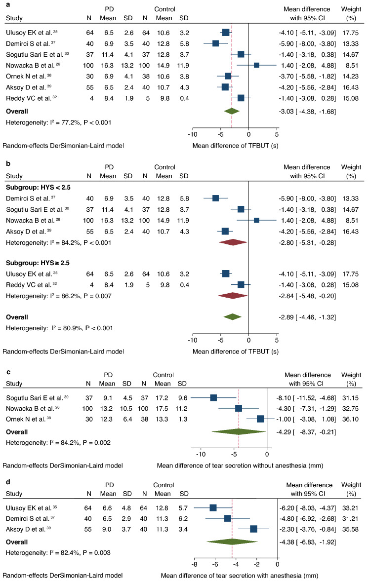 We investigated and characterized the prevalence of dry eye disease (DED) in Parkinson's disease (PD). PubMed and EMBASE databases were searched for relevant studies between January 1, 1979 and March 10, 2022. Quality was assessed using the Joanna Briggs Institute Critical Appraisal Checklist. Study-specific estimates were combined using the DerSimonian-Laird random-effects model. Prevalence of subjective DED symptoms in patients with PD and mean differences in blink rate, corneal thickness, tear film breakup time, and tear secretion volume on Schirmer test I were compared to those in controls. Of 383 studies, 13 (1519 patients with PD) and 12 were included in qualitative and quantitative syntheses, respectively. Meta-analysis revealed a 61.1% prevalence of subjective DED symptoms in PD and that, compared with controls, patients with PD had significantly lower blink rate, thinner corneal thickness, shorter tear film breakup time, and lower tear secretion volumes on Schirmer test I, without and with anesthesia.