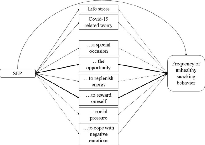 Results: Analyses revealed that people seem to find more reasons to snack when they are stressed, and that this association was more pronounced for people with a high compared to low socio-economic position. Furthermore, a higher socio-economic position was associated with a higher frequency of snacking, and both snacking to reward oneself and snacking because of the opportunity to do so remained significant mediators.