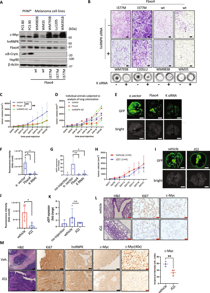 Heterogeneous Nuclear Ribonucleoprotein K (hnRNPK) is a multifunctional RNA binding protein (RBP) localized in the nucleus and the cytoplasm. Abnormal cytoplasmic enrichment observed in solid tumors often correlates with poor clinical outcome. The mechanism of cytoplasmic redistribution and ensuing functional role of cytoplasmic hnRNPK remain unclear. Here we demonstrate that the SCFFbxo4 E3 ubiquitin ligase restricts the pro-oncogenic activity of hnRNPK via K63 linked polyubiquitylation, thus limiting its ability to bind target mRNA. We identify SCFFbxo4-hnRNPK responsive mRNAs whose products regulate cellular processes including proliferation, migration, and invasion. Loss of SCFFbxo4 leads to enhanced cell invasion, migration, and tumor metastasis. C-Myc was identified as one target of SCFFbxo4-hnRNPK. Fbxo4 loss triggers hnRNPK-dependent increase in c-Myc translation, thereby contributing to tumorigenesis. Increased c-Myc positions SCFFbxo4-hnRNPK dysregulated cancers for potential therapeutic interventions that target c-Myc-dependence. This work demonstrates an essential role for limiting cytoplasmic hnRNPK function in order to maintain translational and cellular homeostasis.