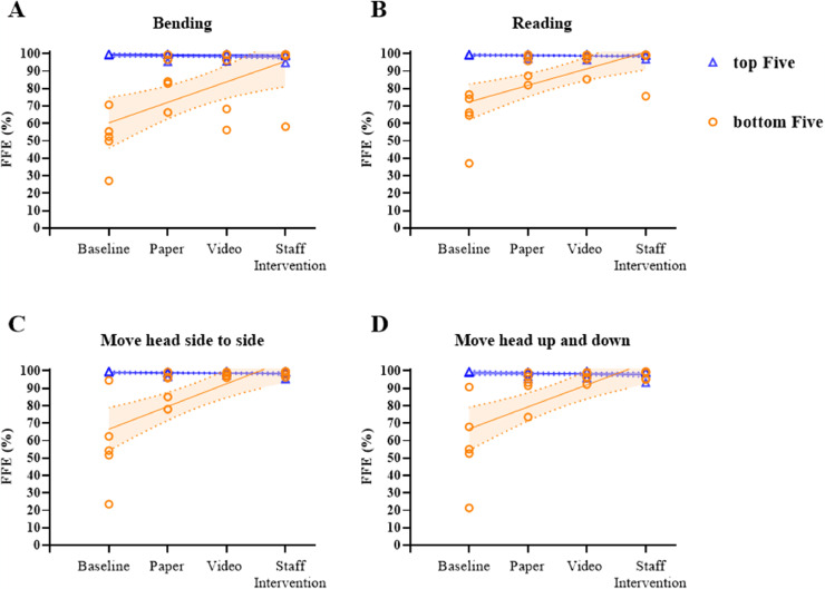 Results: Baseline fitted filtration efficiency was not significantly different between participants with or without previous experience of N95 use. Clear improvements in fitted filtration efficiency were observed progressing from baseline (average=86.1%) to manufacturer paper instructions (93.3%), video instructions (97.5%), and post staff intervention (98.3%). Baseline fitted filtration efficiency values were significantly lower than those after video instruction (p<0.037) and staff intervention (p<0.033) sessions.