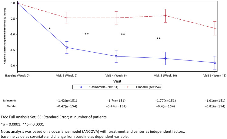 Results: The trial enrolled 307 patients. At week 16, the difference in the change of the mean total daily OFF time between safinamide and placebo groups was 1.10 h (p < 0.0001). This change was significantly greater in the safinamide group starting from week 2, suggesting a rapid onset of drug efficacy. ON time, Unified Parkinson's Disease Rating Scale, Clinical Global Impression scale, and the 39-Item Parkinson's Disease Questionnaire showed statistically significant improvements. There were no significant between-group differences for adverse events or serious adverse events.