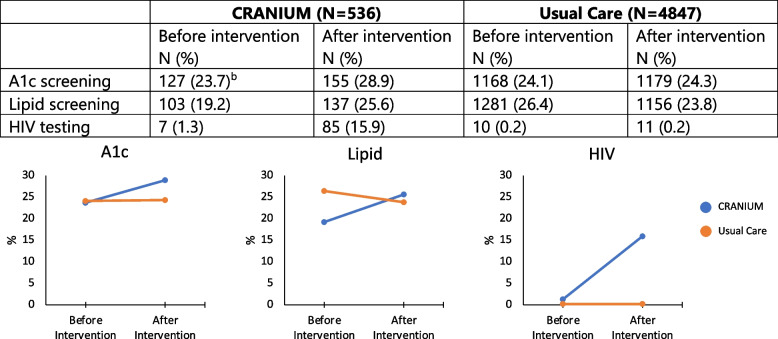 Results: Rates of lipid screening and HIV testing increased significantly at the intervention site compared to usual care, with and without multivariable adjustment [Lipid: aOR 1.90, 95% CI 1.32-2.75, P = .001; HIV: aOR 23.42, 95% CI 5.94-92.41, P < .001]. While we observed a significant increase in A1c screening rates at the intervention site, this increase did not persist after multivariable adjustment (aOR 1.37, 95% CI .95-1.99, P = .09).