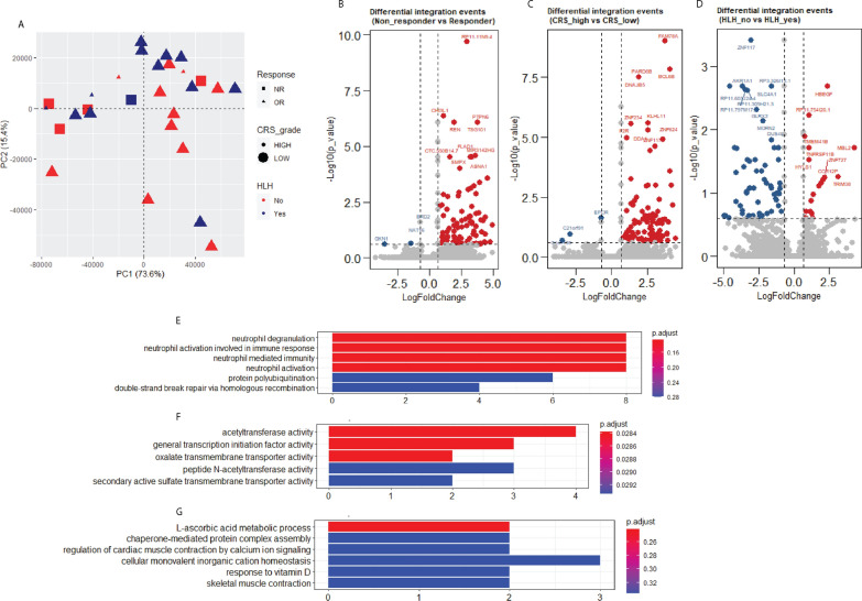 Results: We found that γ-retroviral vectors were more likely to insert than lentiviral vectors into promoter, untranslated, and exon regions, while lentiviral vector integration sites were more likely to occur in intron and intergenic regions. Some integration events affected gene expression at the transcriptional and post-transcriptional level. Moreover, γ-retroviral vectors showed a stronger impact on the host transcriptome. Analysis of individuals with different clinical outcomes revealed genes with differential enrichment of integration events. These genes may affect biological functions by interrupting amino acid sequences and generating abnormal proteins, instead of by affecting mRNA expression. These results suggest that vector integration is associated with CAR T-cell efficacy and clinical responses.