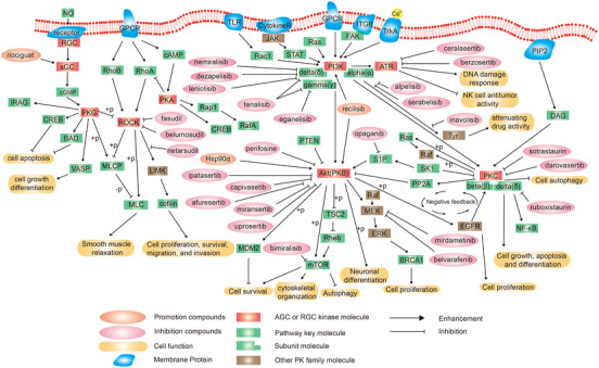 Protein phosphorylation is an important post-transcriptional modification involving an extremely wide range of intracellular signaling transduction pathways, making it an important therapeutic target for disease intervention. At present, numerous drugs targeting protein phosphorylation have been developed for the treatment of various diseases including malignant tumors, neurological diseases, infectious diseases, and immune diseases. In this review article, we analyzed 303 small-molecule protein phosphorylation kinase inhibitors (PKIs) registered and participated in clinical research obtained in a database named Protein Kinase Inhibitor Database (PKIDB), including 68 drugs approved by the Food and Drug Administration of the United States. Based on previous classifications of kinases, we divided these human protein phosphorylation kinases into eight groups and nearly 50 families, and delineated their main regulatory pathways, upstream and downstream targets. These groups include: protein kinase A, G, and C (AGC) and receptor guanylate cyclase (RGC) group, calmodulin-dependent protein kinase (CaMK) group, CMGC [Cyclin-dependent kinases (CDKs), Mitogen-activated protein kinases (MAPKs), Glycogen synthase kinases (GSKs), and Cdc2-like kinases (CLKs)] group, sterile (STE)-MAPKs group, tyrosine kinases (TK) group, tyrosine kinase-like (TKL) group, atypical group, and other groups. Different groups and families of inhibitors stimulate or inhibit others, forming an intricate molecular signaling regulatory network. This review takes newly developed new PKIs as breakthrough point, aiming to clarify the regulatory network and relationship of each pathway, as well as their roles in disease intervention, and provide a direction for future drug development.