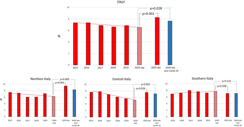 Results: During the period of observation, 48.447 NSTEMI hospitalizations occurred in Italy. Among these, 4981 NSTEMI patients were admitted during the 2020 outbreak: 173 (3.5%) with and 4808 (96.5%) without a Covid-19 diagnosis. According to the 5-year trend, the 2020 expected rate of 30-day and 6-month all-cause mortality was 6.5% and 12.2%, while the observed incidence of death was 8.3% (p = 0.001) and 13.6% (p = 0.041), respectively. Excluding NSTEMI patients with a Covid-19 diagnosis, the 6-month mortality rate resulted in accordance with the prior 5-year trend. After multiple corrections, the presence of Covid-19 diagnosis resulted one of the independent predictors of all-cause mortality at 30 days [adjusted odds ratio (OR) 4.3; 95% confidence intervals (CI) 2.90-6.23; p < 0.0001] and 6 months (adjusted OR 3.5; 95% CI: 2.43-5.03; p < 0.0001).