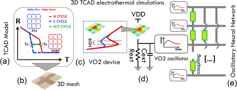 Volatile memristors are versatile devices whose operating mechanism is based on an abrupt and volatile change of resistivity. This switching between high and low resistance states is at the base of cutting edge technological implementations such as neural/synaptic devices or random number generators. A detailed understanding of this operating mechanisms is essential prerequisite to exploit the full potentiality of volatile memristors. In this respect, multi-physics device simulations provide a powerful tool to single out material properties and device features that are the keys to achieve desired behaviors. In this paper, we perform 3D electrothermal simulations of volatile memristors based on vanadium dioxide (VO[Formula: see text]) to accurately investigate the interplay among Joule effect, heat dissipation and the external temperature [Formula: see text] over their resistive switching mechanism. In particular, we extract from our simulations a simplified model for the effect of [Formula: see text] over the negative differential resistance (NDR) region of such devices. The NDR of VO[Formula: see text] devices is pivotal for building VO[Formula: see text] oscillators, which have been recently shown to be essential elements of oscillatory neural networks (ONNs). ONNs are innovative neuromorphic circuits that harness oscillators' phases to compute. Our simulations quantify the impact of [Formula: see text] over figures of merit of VO[Formula: see text] oscillator, such as frequency, voltage amplitude and average power per cycle. Our findings shed light over the interlinked thermal and electrical behavior of VO[Formula: see text] volatile memristors and oscillators, and provide a roadmap for the development of ONN technology.
