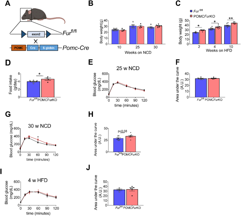 Methods: POMC-Cre+/- mice were bred with Furinfl/fl mice to generate conditional knockout mice with Furin-deletion in neurons expressing proopiomelanocortin (POMCFurKO), and Furinfl/fl mice were used as controls. POMCFurKO and controls were periodically monitored on both normal chow diet and high fat diet (HFD) for body weight and glucose tolerance by established in-vivo procedures. Food intake was measured in HFD-fed FurKO and controls. Hypothalamic Pomc mRNA was measured by RT-qPCR. ELISAs quantified POMC protein and resulting peptides in the hypothalamic extracts of POMCFurKO mice and controls. The in-vitro processing of POMC was studied by biochemical techniques in HEK293T and CHO cell lines lacking FURIN.