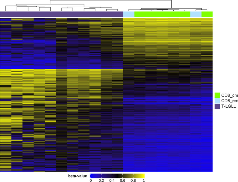 Conclusions: DNA methylation is altered in T-LGLL cells compared to benign T cells. In particular, BCL11B is highly significant differentially methylated in T-LGLL cells. Although our results have to be validated in a larger patient cohort, BCL11B could be considered as a potential biomarker for this leukemia. In addition, altered gene expression and hypermethylation of enhancer regions could serve as potential mechanisms for treatment of this disease. Gene interactions of dysregulated genes, like BLC11B and C14orf64, may play an important role in pathogenic mechanisms and should be further analyzed.