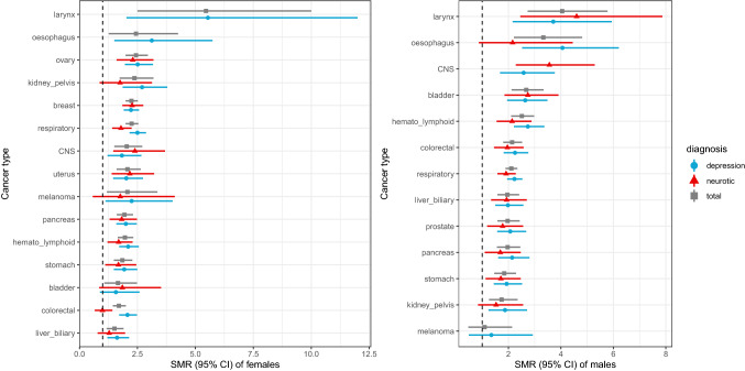 Results: Among 101,487 patients suffering from CMDs (55.7% depression; 44.3% neurotic disorders), 3,087 (37.8%) died from neoplasms. The total standardized mortality ratio (SMR) was 1.82 (95% CI 1.78-1.86) while the SMR for all neoplasms was 2.08 (95% CI 2.01-2.16). Individuals of both genders, with both depressive and neurotic disorders had a higher risk of death from almost all cancers compared with the regional population.