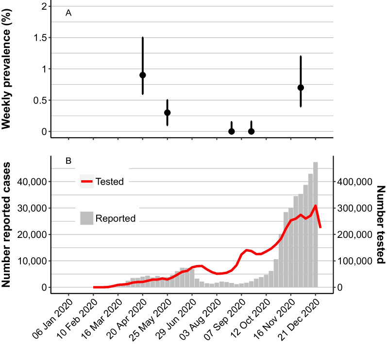 Interpretation: None of the individuals shown to be PCR-positive were asymptomatic at the time of sampling or in the 14 days prior to sampling. This is in contrast to many other surveys in which a substantial proportion of positive cases have been reported to be asymptomatic. Our surveys demonstrate a decreasing ratio between notified cases and the observed prevalence throughout the year, in line with increasing testing capacity and the consecutive inclusion of all symptomatic individuals in the case definition for testing.