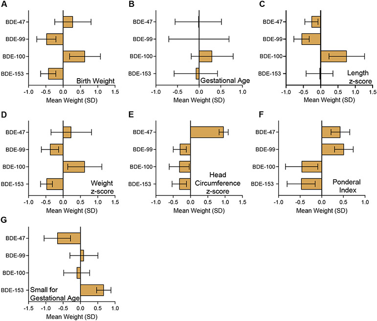 Results: Adjusting for relevant covariates, the high exposure category of BDE-153 was associated with lower birth weight z-score (-0.25, 95% CI: -0.5, 0.0) and longer gestation (0.43 weeks, 95% CI: 0.07, 0.79). The high exposure category of BDE-99 was associated with lower birth length z-score (-0.55, 95% CI: -0.98, -0.12). There was a negative association between the overall PBDE mixture and birth length z-score (-0.10, 95% CI: -0.21, 0.00) per 1 quintile increase in PBDEs. There was no effect modification by sex or ethnicity.