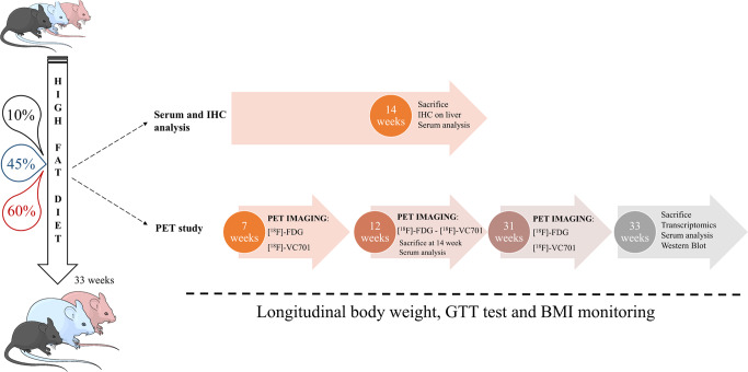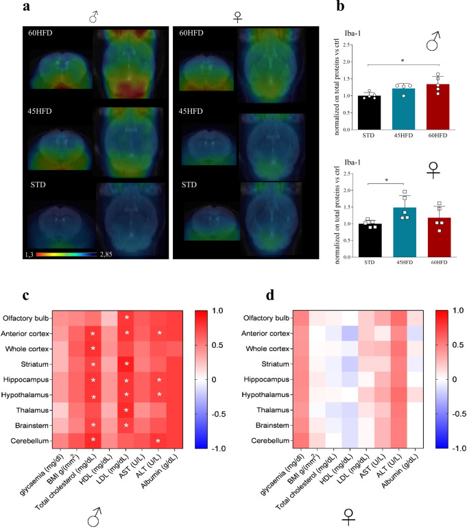 We examined effects of exposing female and male mice for 33 weeks to 45% or 60% high fat diet (HFD). Males fed with either diet were more vulnerable than females, displaying higher and faster increase in body weight and more elevated cholesterol and liver enzymes levels. Higher glucose metabolism was revealed by PET in the olfactory bulbs of both sexes. However, males also displayed altered anterior cortex and cerebellum metabolism, accompanied by a more prominent brain inflammation relative to females. Although both sexes displayed reduced transcripts of neuronal and synaptic genes in anterior cortex, only males had decreased protein levels of AMPA and NMDA receptors. Oppositely, to anterior cortex, cerebellum of HFD-exposed mice displayed hypometabolism and transcriptional up-regulation of neuronal and synaptic genes. These results indicate that male brain is more susceptible to metabolic changes induced by HFD and that the anterior cortex versus cerebellum display inverse susceptibility to HFD.
