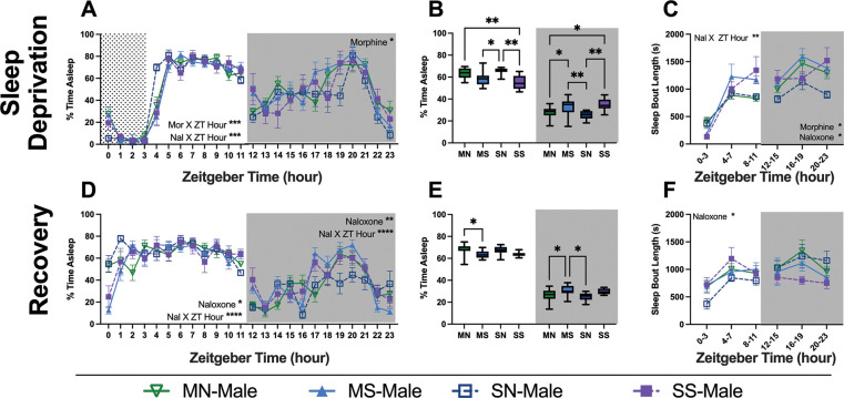 Highlights: Morphine withdrawal differentially dysregulates the sleep of male and female mice3-day precipitated withdrawal results in larger changes than spontaneous withdrawalOpioid withdrawal affects responses to future sleep deprivation differently between sexes.