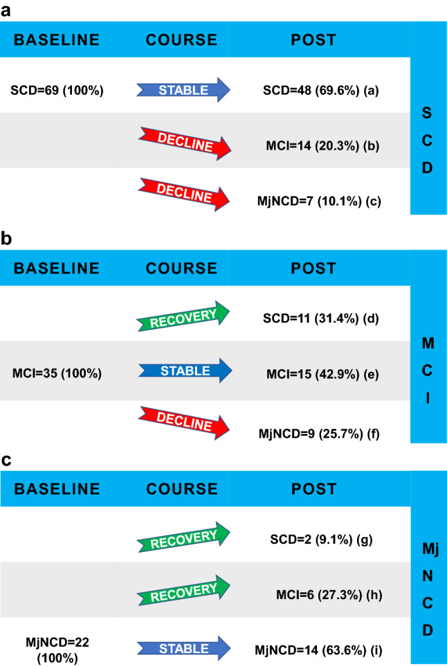 Results: Overall, 126 subjects with a clinical diagnosis of NCD were included (52% female, mean age 71 ± 10.6 years (range 35e86)), number of follow-up visits per subject 2.9 ± 2.4, observation time per subject 3.4 ± 2.8 years). Of these, 55/28/17% presented with the clinical stages subjective cognitive decline (SCD)/mild cognitive impairment (MCI)/dementia (major NCD). Clinical diagnoses, retrospectively re-evaluated according to DSM-5, were 5/21/68/6% Alzheimer´s disease (NCD-AD)/vascular NCD (NCD-vascular) / mixed NCD (NCD-AD + NCD-vascular)/unspecified NCD. First longitudinal results revealed a mean DemTect score at baseline 12.6 ± 4.2 vs last visit 12.0 ± 4.8 (p = 0.08) and a clock drawing test score at baseline 1.9 ± 1.3 vs last visit 2.3 ± 1.5 (p < 0.0001). Of all subjects with MCI or major NCD (n = 57), 19 improved in the clinical stage from baseline to last visit (33.3%). Sixteen subjects progressed from SCD or MCI (n = 104) to major NCD (15.4%).