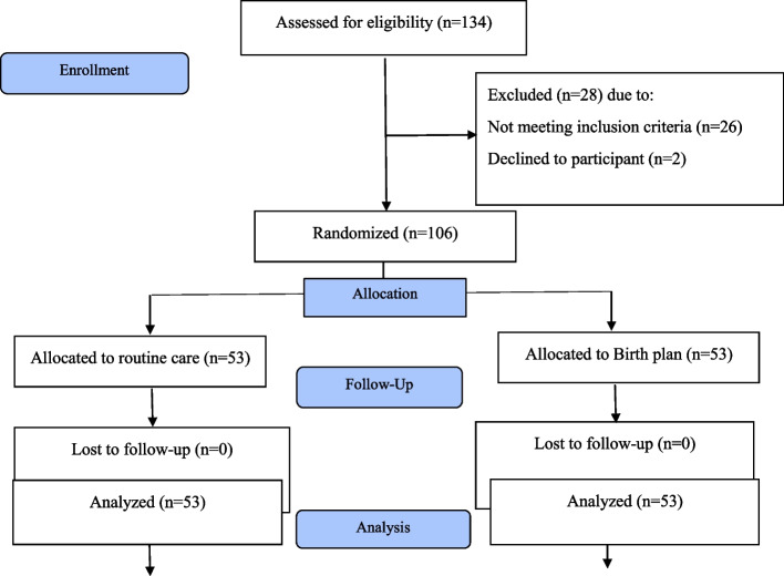 Methods: This study was a randomized controlled clinical trial performed on 106 pregnant women, 32-36 weeks of pregnancy, referring to Taleghani educational hospital in Tabriz city-Iran. Participants were randomly assigned to the two groups of birth plan and control using a randomized block method. Participants in the birth plan group received the interventions based on the mother's requested birth plan. The birth plan included items of the mother's preferences in labor, mobility, eating and drinking, monitoring, pain relief, drug options, labor augmentation, pushing, amniotomy, episiotomy, infant care, and caesarean section. The control group received routine hospital care. The primary outcomes were childbirth experience and duration of the active phase of labor and the secondary outcomes were support and control in labor, fear of labor, post-traumatic stress disorder (PTSD), postpartum depression, duration of the second and third phases of labor, frequency of vaginal delivery, frequency of admission of newborn in NICU (Neonatal Intensive Care Unit), the mean first and fifth minute Apgar scores. The socio-demographic and obstetrics characteristics questionnaire, Wijma Delivery Expectancy/Experience Questionnaire (W-DEQ-versions A), and Edinburgh Postnatal Depression Scale (EPDS) were completed at the beginning of the study (at the gestational age of 32-36 weeks). The questionnaire of delivery information, neonatal information, and Delivery Fear Scale (DFS) was completed during and after the delivery. Also, a partogram was completed for all participants by the researcher. The participants in both groups followed up until 4-6 weeks post-delivery, whereby the instruments of Childbirth Experience Questionnaire 2.0 (CEQ2.0), Support and Control In Birth (SCIB) scale, EPDS, and PTSD Symptom Scale 1 (PSS-I) were completed by the researcher through an interview. The independent t-test, the chi-square test, and ANCOVA was used to analyze.
