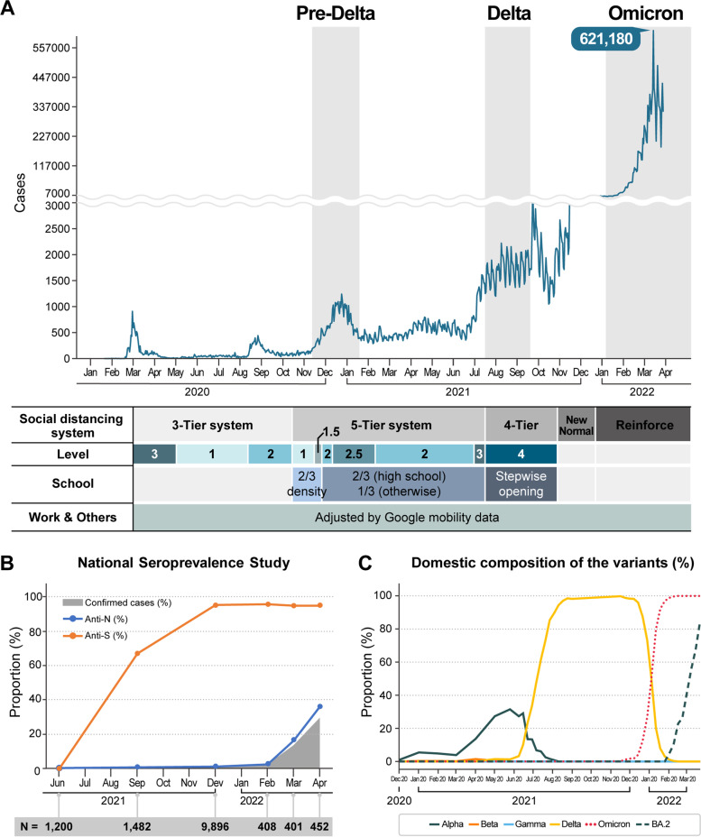 Methods: We developed an age-structured compartmental model, combining age-specific contact matrix in South Korea and observed distribution of periods between each stage of infection in the national epidemiological investigation. A Bayesian inference method was used to estimate the age-specific force of infection and, accordingly, age-specific susceptibility, given epidemic data during the third (pre-Delta), fourth (Delta driven), and fifth (Omicron driven) waves in South Korea. As vaccine uptake increased, individuals who were vaccinated were excluded from the susceptible population in accordance with vaccine effectiveness against the Delta and Omicron variants, respectively.