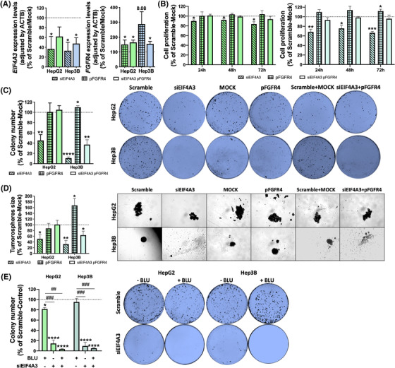 Results: Spliceosomal dysregulations were consistently found in retrospective and in silico cohorts. EIF4A3, RBM3, ESRP2 and SRPK1 were the most dysregulated spliceosome elements in HCC. EIF4A3 expression was associated with decreased survival and greater recurrence. Plasma EIF4A3 levels were significantly elevated in HCC patients. In vitro EIF4A3-silencing (or pharmacological inhibition) resulted in reduced aggressiveness, and hindered xenograft-tumours growth in vivo, whereas EIF4A3 overexpression increased tumour aggressiveness. EIF4A3-silencing altered the expression and splicing of key HCC-related genes, specially FGFR4. EIF4A3-silencing blocked the cellular response to the natural ligand of FGFR4, FGF19. Functional consequences of EIF4A3-silencing were mediated by FGFR4 splicing as the restoration of non-spliced FGFR4 full-length version blunted these effects, and FGFR4 inhibition did not exert further effects in EIF4A3-silenced cells.