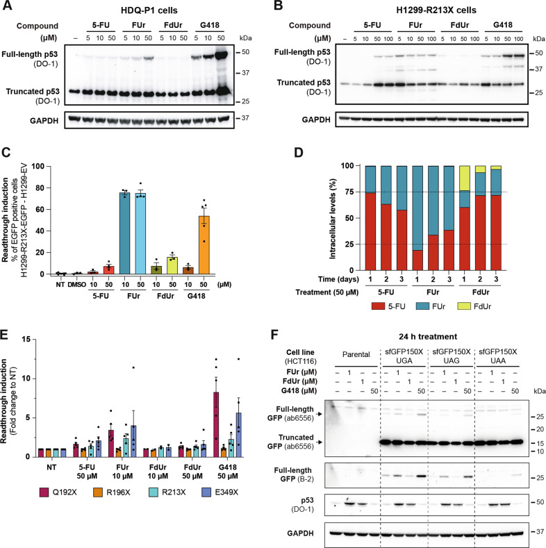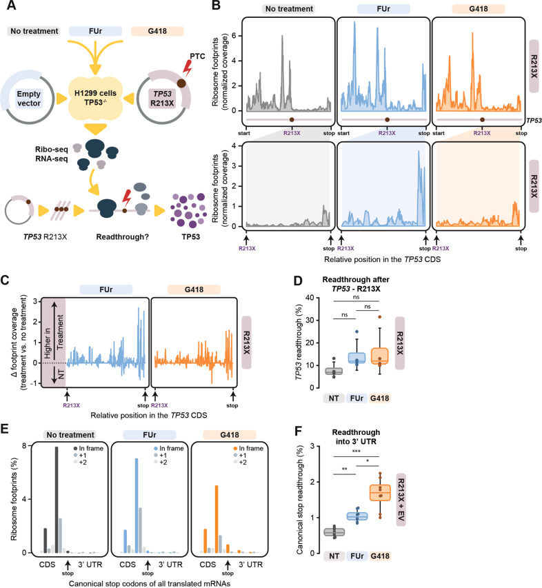 TP53 nonsense mutations in cancer produce truncated inactive p53 protein. We show that 5-FU metabolite 5-Fluorouridine (FUr) induces full-length p53 in human tumor cells carrying R213X nonsense mutant TP53. Ribosome profiling visualized translational readthrough at the R213X premature stop codon and demonstrated that FUr-induced readthrough is less permissive for canonical stop codon readthrough compared to aminoglycoside G418. FUr is incorporated into mRNA and can potentially base-pair with guanine, allowing insertion of Arg tRNA at the TP53 R213X UGA premature stop codon and translation of full-length wild-type p53. We confirmed that full-length p53 rescued by FUr triggers tumor cell death by apoptosis. FUr also restored full-length p53 in TP53 R213X mutant human tumor xenografts in vivo. Thus, we demonstrate a novel strategy for therapeutic rescue of nonsense mutant TP53 and suggest that FUr should be explored for treatment of patients with TP53 nonsense mutant tumors.