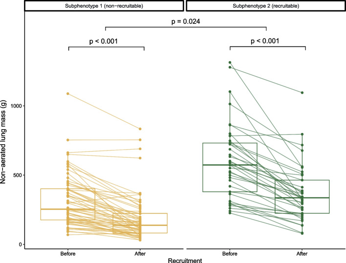 Results: 99 patients were included. Using 12 variables, a two-class LCA model was identified as best fitting. Subphenotype 2 (recruitable) was characterized by a lower PaO2/FiO2, lower normally aerated lung volume and lower compliance as opposed to a higher non-aerated lung mass and higher mechanical power when compared to subphenotype 1 (non-recruitable). Patients with subphenotype 2 had more decrease in non-aerated lung mass in response to a standardized recruitment manoeuvre (p = 0.024) and were mechanically ventilated longer until successful extubation (adjusted SHR 0.46, 95% CI 0.23-0.91, p = 0.026), while no difference in survival was found (p = 0.814).