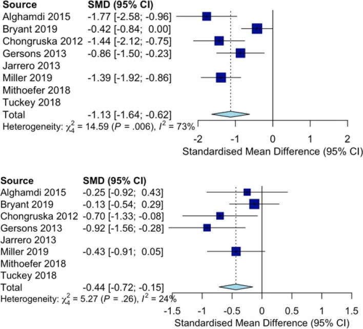 Results: The analyses included data from eight randomized controlled trials representing 402 PSP (79.4% male, 35.3 years). Psychological interventions included narrative exposure therapy (n = 1), cognitive behavioral therapy (n = 2), eclectic psychotherapy (n = 2), eye-movement desensitization and reprocessing (n = 1), supportive counseling (n = 2), and group critical incident stress debriefing (n = 1). The interventions were associated with statistically significant reductions in symptoms associated with PTSD (d = - 1.23; 95% CI - 1.81, - 0.65; 7 studies; I2 = 81%), anxiety (- 0.76; 95% CI - 1.28, - 0.24; 3 studies; I2 = 47%), and depression (d = - 1.10; 95% CI - 1.62, - 0.58; 5 studies; I2 = 64%). There were smaller but statistically significant improvements at follow-up for symptoms of PTSD (d = - 1.29 [- 2.31, - 0.27]), anxiety (d = - 0.82 [- 1.20, - 0.44]), and depression (d = - 0.46 [- 0.77, - 0.14]). There were no statistically significant differences in dropout rates (RR = 1.00 [0.96, 1.05]), suggesting high acceptability across interventions.
